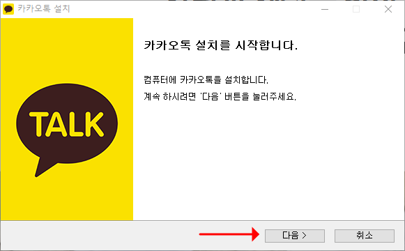 1. 카카오톡 설치 파일을 다운로드 받고 실행 후 다음 >을 클릭합니다.